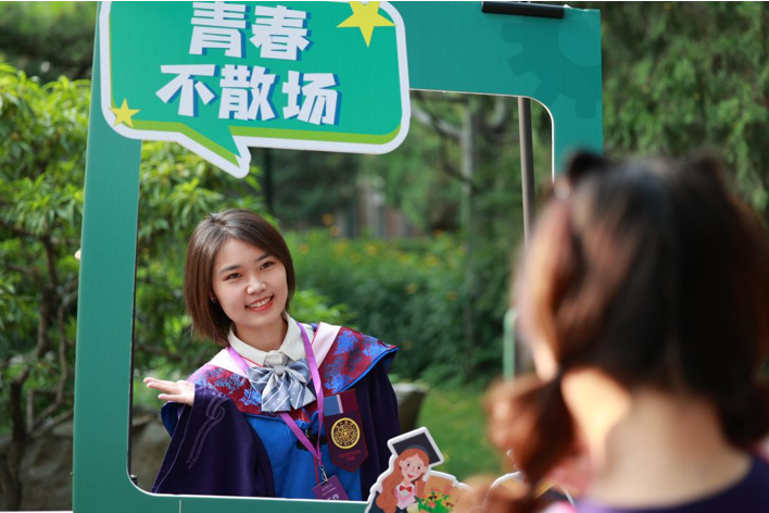 Tsinghua graduates gathered at the main commencement ceremony venue outside the Tsinghua Auditorium, and nine other outdoor viewing points on campus, to watch their commencement ceremony and receive their hard-earned degrees while maintaining physical safety standards.