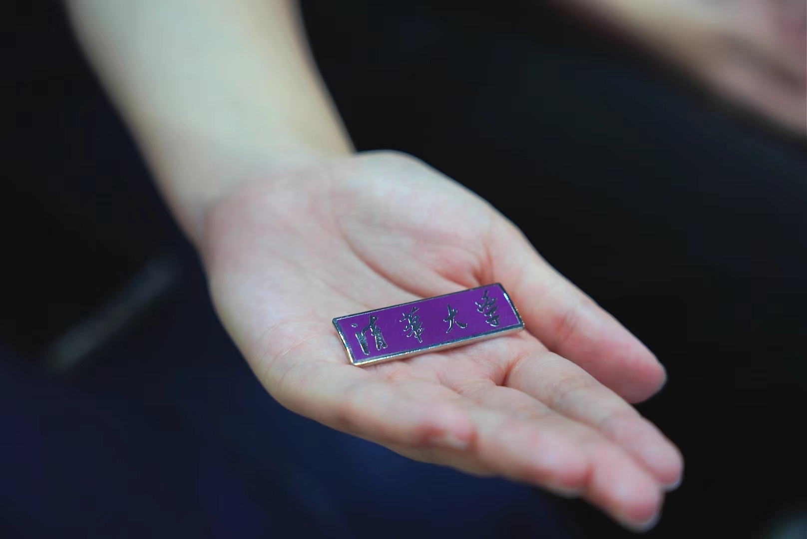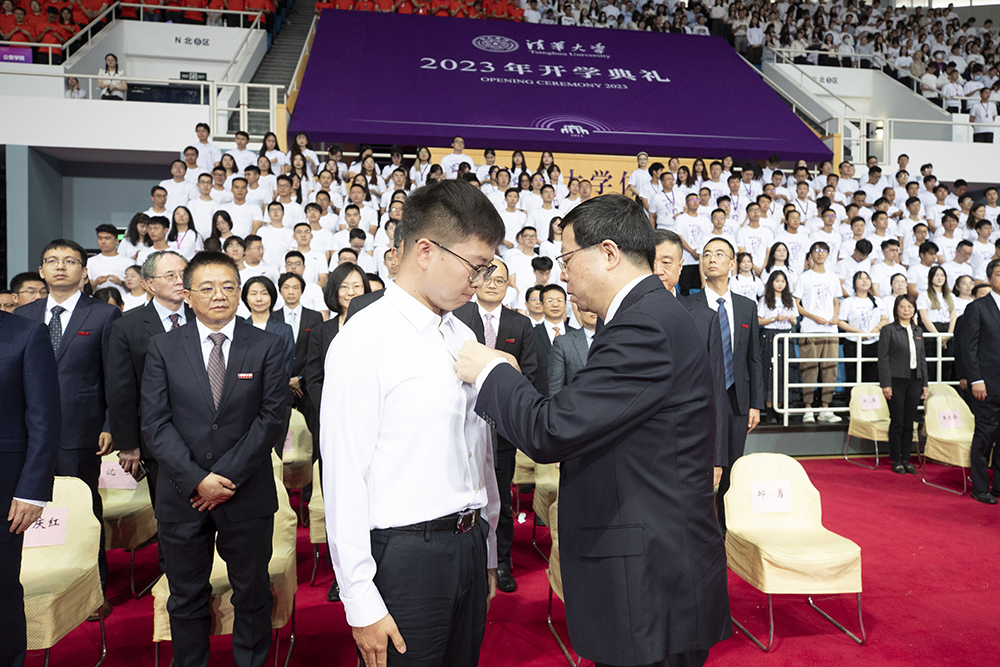 Qiu Yong, secretary of the CPC Tsinghua University Committee, pinned a Tsinghua badge on the graduate student representative.