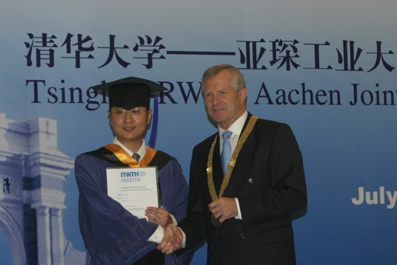 “The ceremony here today marks one of the most important milestones in your life”, said President Gu, “ you have had the opportunity to study in the Tsinghua-Aachen joint program, which provides you not only well designed coursework but also the opportunity to explore the outside world and broaden your global perspective.” He said that the students should take over the tradition of Tsinghua University to make lasting contributions to the advancement of science and technology, to the sustainable development of the country, and to the peace of the world.