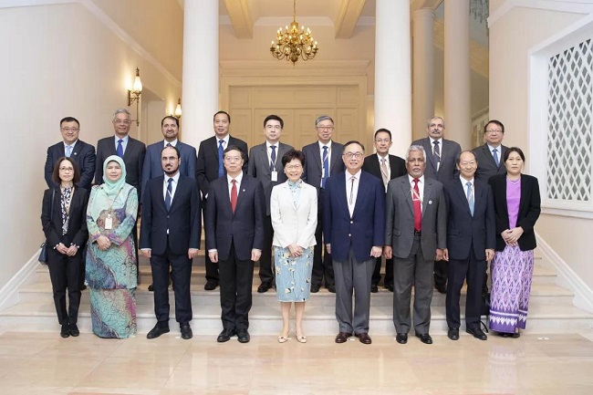 Prior to the Board meeting, Chief Executive of the Hong Kong Special Administrative Region (HKSAR) The Honorable Mrs Carrie LAM CHENG Yuet-Ngor, GBM, GBS met with the representatives from the AUA member universities to congratulate the opening of the AUA Summit in Hong Kong. Representatives from the AUA member universities attending the meeting were Qiu Yong, President of Tsinghua University, Wei Shyy, President of the Hong Kong University of Science and Technology, OH Se‐Jung, President of Seoul National University, Bundhit Eua‐arporn, President of the Chulalongkorn University, Muhammad Anis, Rector of Universitas Indonesia, Lakshman Dissanayake, Former Vice-Chancellor of University of Colombo, Devang Khakhar, Director of the Indian Institute of Technology Bombay, Mohamed Albaili, Vice Chancellor of the United Arab Emirates University, Shigeo Katsu, President of Nazarbayev University, Sawako Shirahase, Executive Vice President of the University of Tokyo, Tian Gang, Vice President of Peking University, Andrew Wee, Vice President of the National University of Singapore, Omar Kyaw, Pro Rector of the University of Yangon, Kamila Ghazali, Deputy Vice-Chancellor of the University of Malaya, and Abdullah Al‐Salman, Vice Rector of King Saud University.