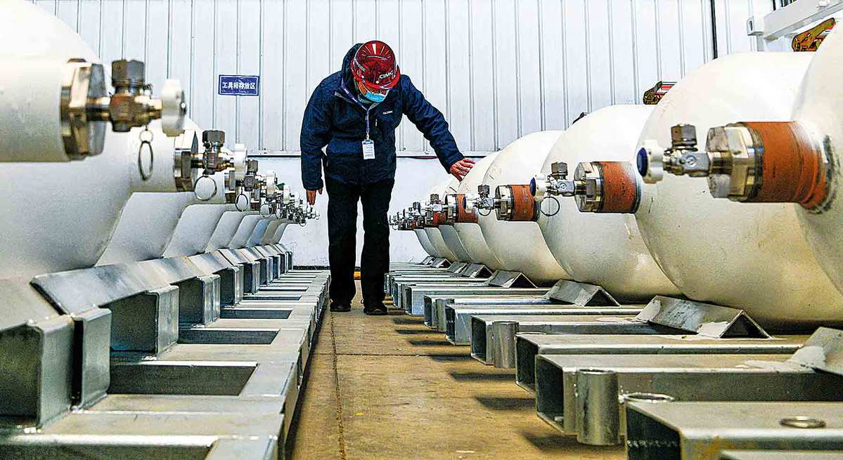 A worker checks on hydrogen tanks slated for use at the Beijing Winter Olympics and Paralympics at a factory in Shijiazhuang, Hebei province, on Nov 11. [LI MINGFA/FOR CHINA DAILY] NDRC, NEA release 2021-35 plan to spur China's pursuit of low-carbon targets