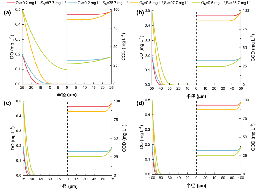 Fig. 2. Profiles of DO and COD in aerobic granules with radii of (a) 25 μm, (b) 50 μm, (c) 75 μm, and (d) 100 μm