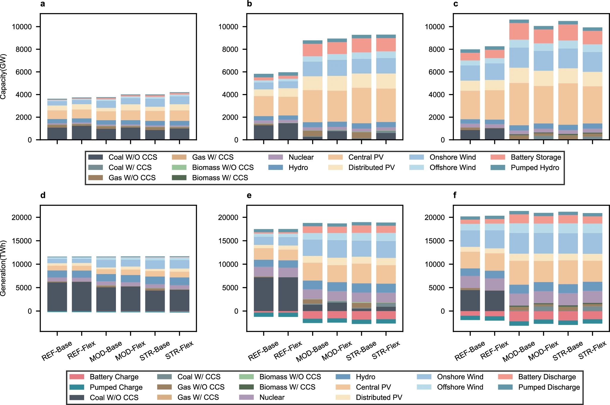a Capacity mix in 2030; (b) capacity mix in 2045; (c) capacity mix in 2060; (d) generation mix in 2030; (e) generation mix in 2045; (f) generation mix in 2060. Scenario names at the X-axis are combinations of two dimensions. REF, MOD, and STR represent no, moderate and stringent emission caps, respectively; Flex and Base represent that coal power can be dispatched flexibly and operates as a base load, respectively. PV solar photovoltaic technology, CCS carbon capture and storage, W/ with, W/O without, GW gigawatt, TWh terawatt-hour. Source data are provided as a Source Data file.