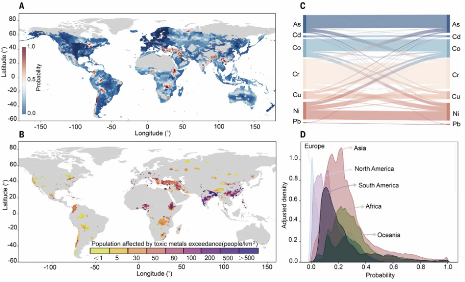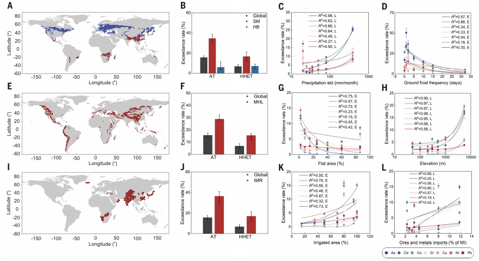 By analyzing 796,084 datapoints of soil concentrations of the key toxic metals from 1,493 regional studies, the research reveals that 14–17% of global cropland (242 million hectares) exceeds agricultural thresholds (AT) for toxic metals. Cadmium (Cd) exhibits the highest exceedance rate (9.0%, −1.9%/+1.5%), concentrated in northern and central India, southern China, South Africa and so on. Nickel (Ni) and chromium (Cr) exceedances are prominent in the Middle East, subarctic Russia, and eastern Africa. Globally, 6.8% (−1.7%/+1.9%) of surficial soil exceeded human health and ecological thresholds (HHET), exposing 0.9–1.4 billion people to elevated risks (Figs. 1, 2).