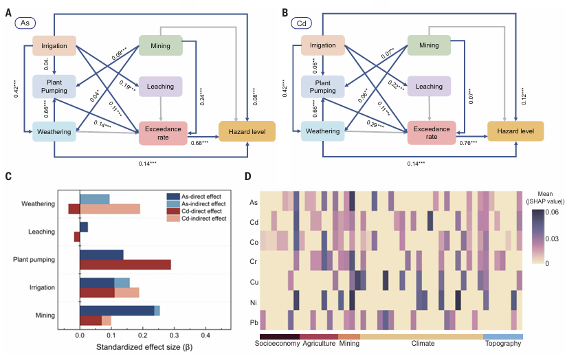 Structural equation modeling (SEM) was also used to assess the causal links between multiple factors (irrigation, mining, plant pumping, etc.) and exceedance rate and hazard level (Fig. 4). These SEM results were in good accordance with the complex importance features of the machine learning models and support the hypothesis that soil toxic metal enrichment is governed by the interplay of a wide range of biogeophysical and socioeconomic variables at broad spatiotemporal scales.