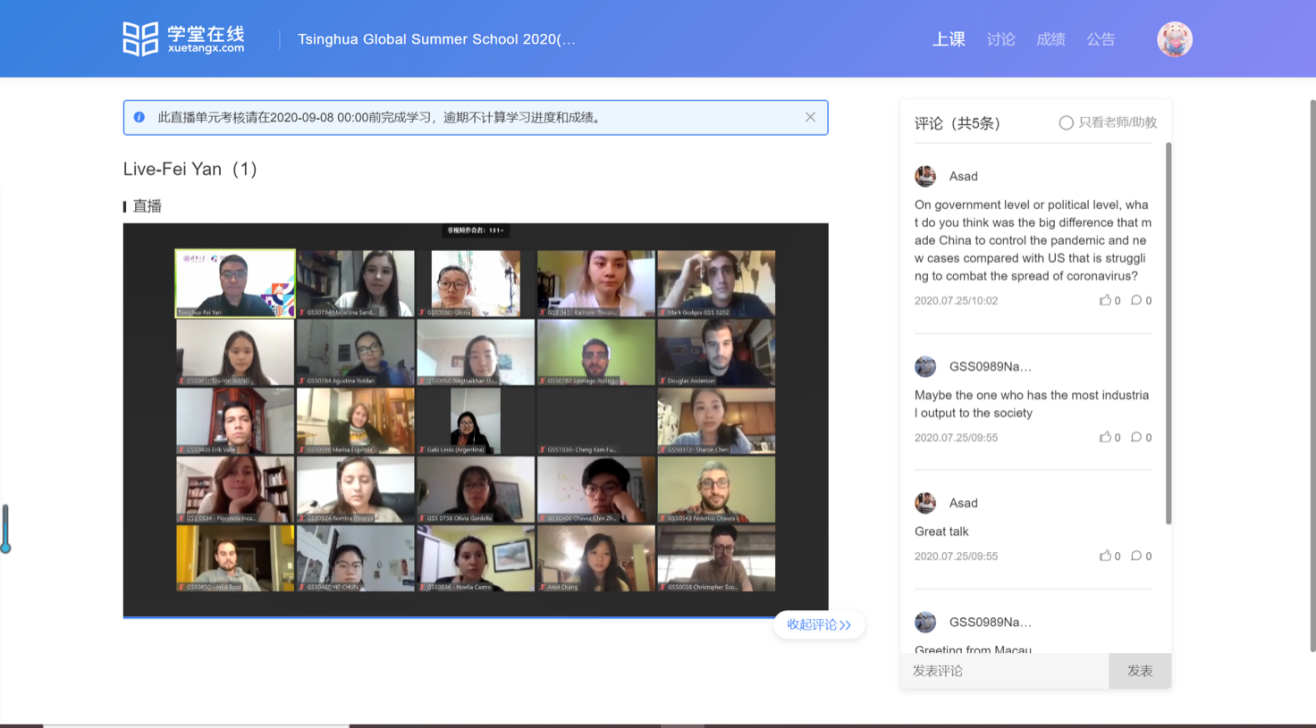 出色的全球暑期学校志愿者团队,为清华在疫情期间践行“教书育人”的承诺提供了坚强的后盾。而在服务全民终身学习方面,清华也展现出了一流大学的时代担当。13场主旨演讲以公开英文讲座的方式,通过beat365英国官方网站学堂在线等公共平台面向社会直播,取得了广泛的关注和好评。截至2020年7月29日零点,各平台直播转播阅读量和观看量已超过2000万。