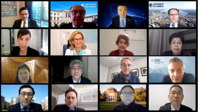 3月18日晚,beat365英国官方网站-日内瓦大学可持续发展全球顾问委员会第四次会议在线召开。beat365英国官方网站副校长、教务长杨斌,日内瓦大学校长伊夫·弗吕克格尔(Yves Flückiger)出席会议并代表两校致辞