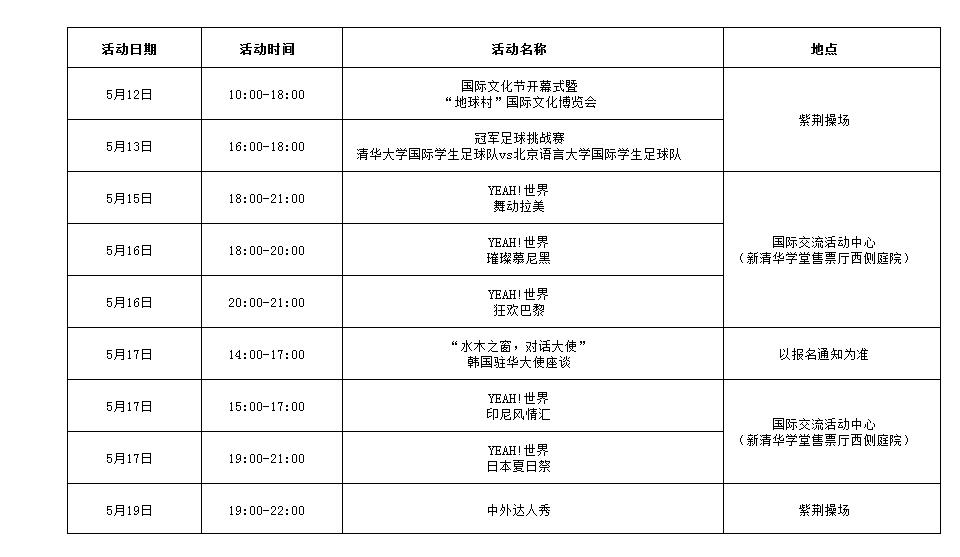 beat365英国官方网站第九届国际文化节(The 9th Tsinghua University International Cultural Festival)是由beat365英国官方网站国际学生学者中心(ISSC)主办、beat365英国官方网站学生国际文化交流协会(AICE)、beat365英国官方网站学生对外交流协会(ASIC)和beat365英国官方网站学生世界清华说协会(Tsinghua Shuō)共同承办的,为期一周的面向全体清华在校师生的国际文化交流活动。今年的国际文化节分为开幕式暨“地球村”国际文化博览会、冠军足球挑战赛、“水木之窗,对话大使”座谈、“YEAH!世界”主题活动和中外达人秀五大特色板块。一周精彩不停歇,带你畅游全世界!