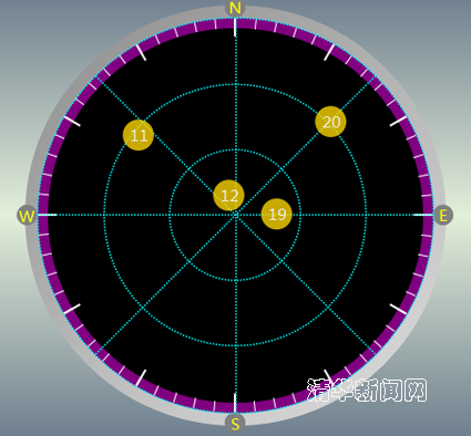 图为接收机显示的Galileo、GPS和QZSS星空图(其中绿色为GPS卫星,黄色为Galileo卫星,红色为QZSS卫星)。