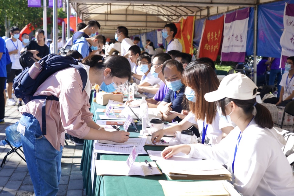 早在新生入学前,为帮助新生更快速地了解疫情防控常态化要求下的迎新流程,熟悉清华校园,融入大一新生活,校团委、学生会依托校园新媒体平台,以图文及视频等方式,制作发布一系列有用、有趣、有料的迎新信息。校园里,以“‘零’云之志,点亮未来”为主题的多项现场迎新活动纷至沓来,帮助新生快速熟悉清华环境。新生们在心愿墙上写下自己的心愿与志向,迎新处的趣味创作小游戏和“清华2020”系列主题盲盒抽取活动让同学们眼前一亮。