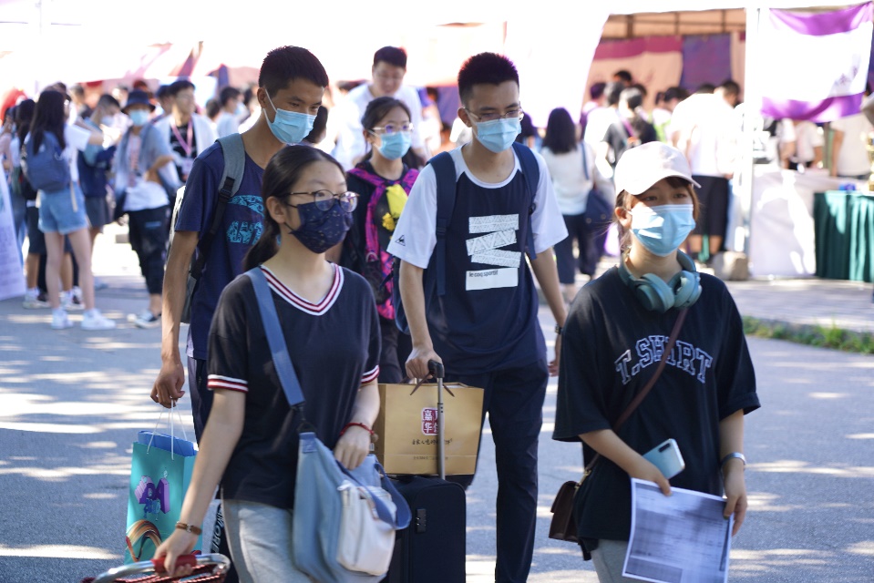 在踏入校门的那一刻起,新生们便要完成独立入校报到的必修课。在疫情防控常态化要求下,送新生的车辆和亲友不能入校,首先迎接他们的便是学生志愿者。不论是接站服务,还是完成报到手续,不论是行李搬运,还是食堂就餐,到处都有学长学姐们热情的身影。