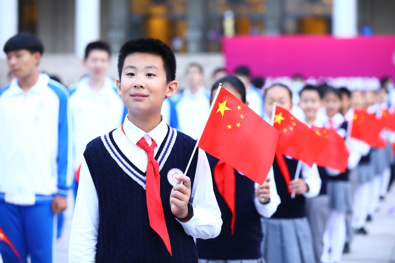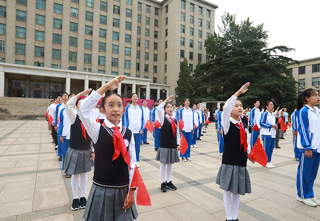 “五星红旗迎风飘扬/胜利歌声多么嘹亮/歌唱我们亲爱的祖国/从今走向繁荣富强……”全体师生挥舞着手中鲜艳的国旗,共同唱响《歌唱祖国》。歌声伴朝阳,水木湛清华,全体师生将以百倍的信心、十足的干劲开启新学年。