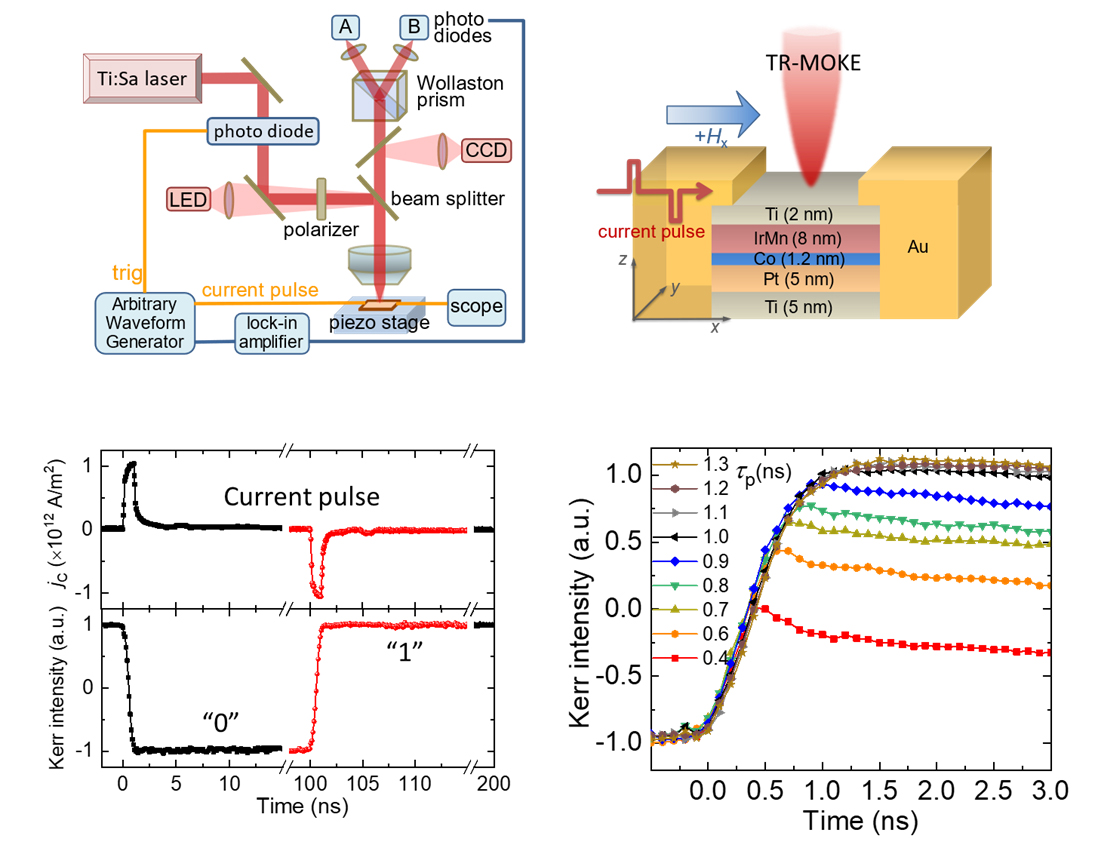 近日,beat365英国官方网站信息国家研究中心联合德国慕尼黑工业大学等研究团队,在磁存储器件的超快自旋动力学探测方面取得突破。研究团队采用时间分辨的磁光克尔探测技术,结合空间分辨的微磁学模拟,首次报道了自旋轨道矩(SOT)磁存储器件在百皮秒时间尺度下的信息写入过程和自旋动力学机制,并实现了器件超快的多值存储和交换偏置调控。该成果对于推动高速磁随机存储器的发展,以及其在存算一体、神经拟态计算方面的应用具有重要意义。