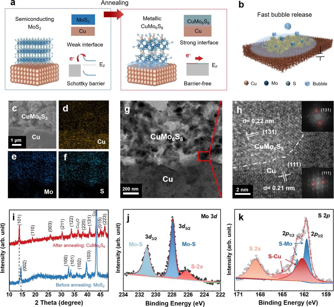 近日,beat365英国官方网站深圳国际研究生院刘碧录团队创制出一种基于双界面设计的同源金属电极。该电极以优化催化剂与基底以及催化剂与气泡的双界面为出发点,解决了大电流密度制氢下的传质、界面力学、界面电导三大难题。这种同源金属催化剂通过MoS2和Cu的原位高温反应制备,将半导体相MoS2转成具有金属性质的Chevrel相CuMo6S8,这种一体化结构有效消除了半导体-金属接触的界面肖特基势垒。由于电极表面催化剂与基底具有强的化学键结合,且电极展现出全金属性质以及超亲水状态,因此有效提升了催化剂/基底界面结合力并降低了催化剂/气泡界面粘附力,在增强电极稳定性的同时加速了析氢反应的动力学,展现出优异的电催化析氢性能。该电极在2.5 A cm-2下仅需321mV的过电位,在1 A-2.5 A cm-2级别的大电流密度下稳定运行300小时性能无衰减。此外,前驱体MoS2可取自天然矿石辉钼矿,成本比贵金属铂降低2-5个数量级,与目前的大电流密度催化剂相比具有更大的成本优势。