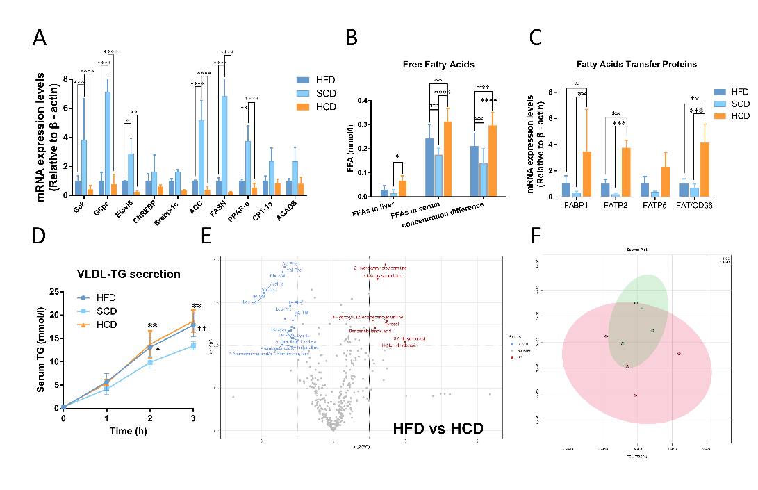 非酒精性脂肪肝的的最主要特征是肝脏内甘油三酯的大量堆积。肝内的甘油三酯含量由5条代谢途径共同决定,其中包括3条“经典”脂质代谢途径:“糖酵解-脂质从头合成”途径、“ChREBP-脂质从头合成”途径、“脂肪酸β氧化”途径;2条“非经典”脂质转运途径:脂肪酸转运入肝途径、VLDL-TG复合体转运途径。通过对以上5条代谢途径中关键酶进行测定,我们发现高淀粉饮食仅在脂肪酸转运途径中表现相较于高脂饮食组小鼠的表达量提升。同时,结合肝脏代谢组学分析数据,进一步证实了以上发现(图2)。从而表明在高淀粉饮食干预下,脂肪酸内流的增加是导致肝内甘油三酯进一步沉积的主要原因。