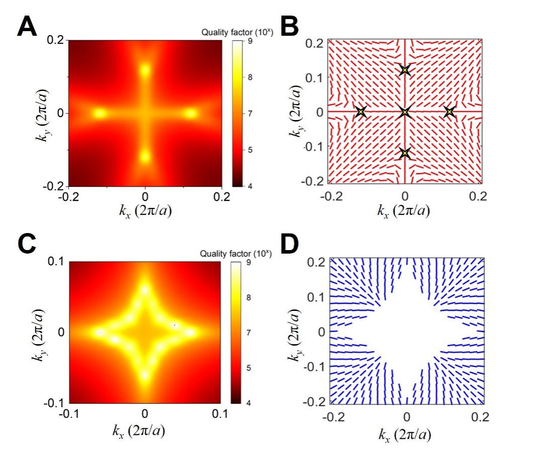 研究团队分别对对称和对称破缺的光子晶体平板进行研究,发现所产生的拓扑光力会对微粒产生捕获和驱散的操控效果(图1)。首先分别对对称和对称破缺的光子晶体平板结构进行仿真,可以得到上下两条本征能带和对应的远场偏振态分布(图2),图2A中的颜色为品质因子的映射,图2B和C分别表示上下两条能带的远场偏振态。根据图2可知,上下两条能带都可以实现BIC,并且上下能带的BIC具有相反的拓扑荷。