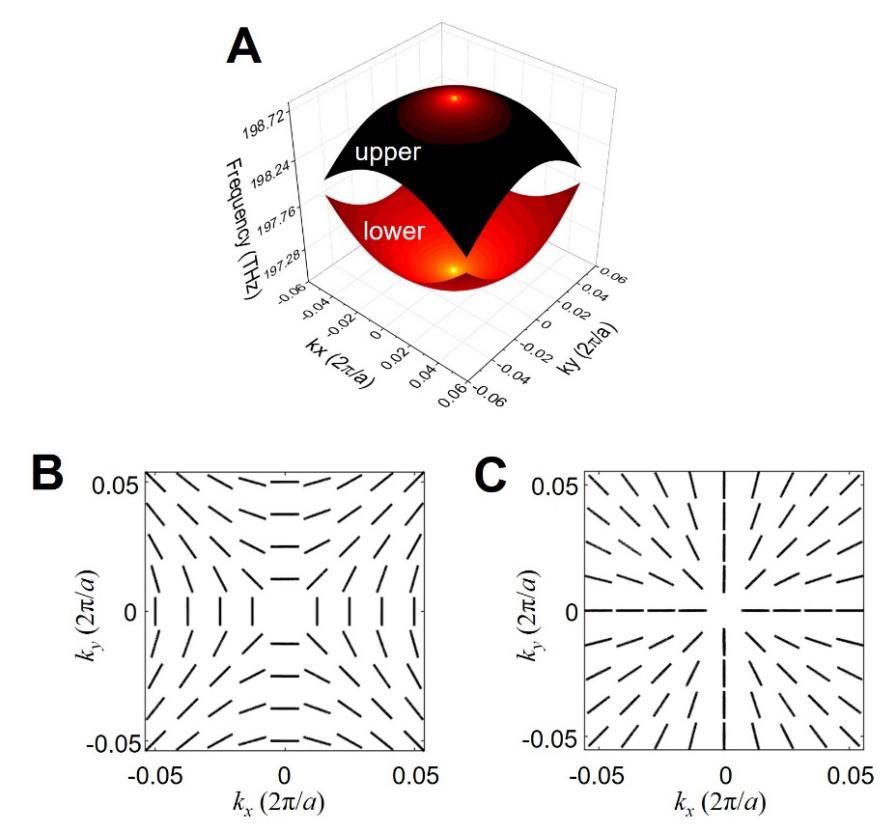 图2.对称的光子晶体平板能带(A)和远场辐射偏振态示意图(B,C)
