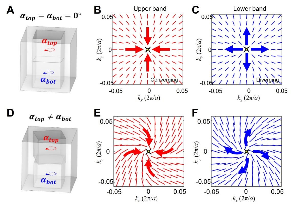 进一步地,研究团队对对称的光子晶体平板(图3A)和对称破缺的光子晶体平板(图3D)对应的动量空间中远场辐射的光力分布进行研究。显然在BIC处会产生一个光力的奇异点,且在BIC附近的光力矢量会围绕BIC点处形成涡旋的光力分布。而且对称结构的上下能带分别会展现出使得微粒向中心捕获和向四周驱散的效果。研究团队也对微粒附近的坡印廷矢量和电场分布进行仿真来印证捕获和发散的效果,并探究了光子晶体平板结构是否存在对于光力的影响。而对于对称性破缺的结构(图3D,即打破z轴对称性),和图3A的结构类似,同样在BIC处实现了一个光力的奇点,在BIC附近光力同样呈现涡旋分布;不同的是,其不仅可以实现对微粒的捕获和驱散效果,还可以进一步操控微粒的自旋。