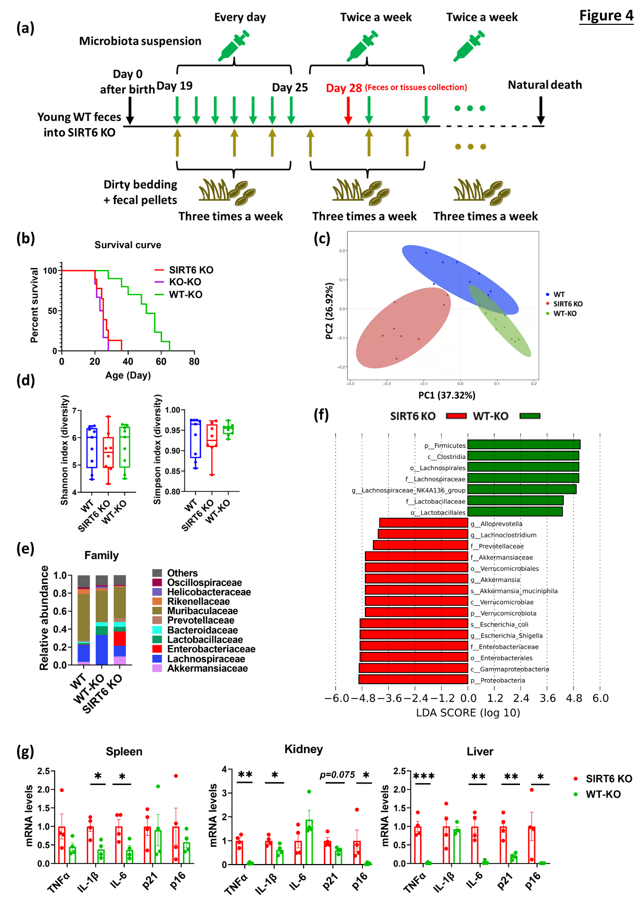 SIRT6敲除小鼠呈现典型的肠道菌群失调表征,包括菌群多样性减少,粪便中短链脂肪酸水平降低,益生菌Bacteroidetes丰度下降及致病菌Enterobacteriaceae、Verrucomicrobiaceae、Proteobacteria、Prevotellaceae等丰度增高。将SIRT6 KO小鼠肠道菌群移植给年轻野生小鼠,野生小鼠出现加速衰老相关表型,具体表现为白色粗糙毛发增多、血糖水平降低、脂肪积累减少、多组织器官炎症因子(TNFα、IL-1β、IL-6)和衰老标志物(P16、P21)表达水平增加等。