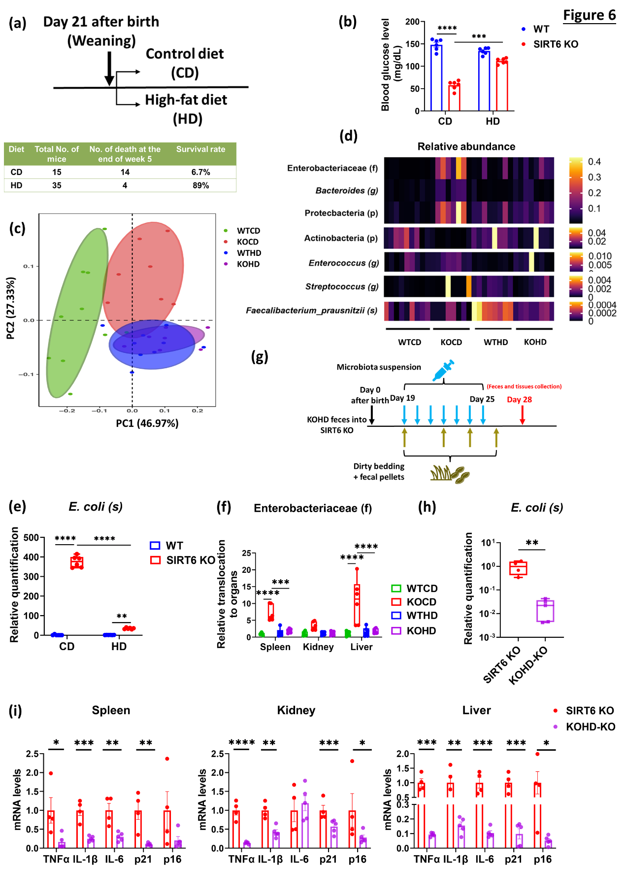 高脂饮食在提高SIRT6 KO小鼠存活率、改善低血糖症的同时,也重塑其菌群,尤其是显著减少Escherichia coli水平及内脏器官Enterobacteriaceae移位。将饮食干预后的SIRT6 KO小鼠菌群再次移植给KO小鼠,依旧能够有效降低KO小鼠组织器官中炎症因子和衰老标志物的表达水平。