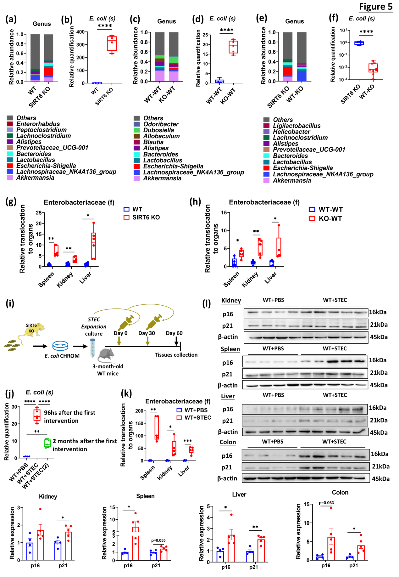 通过比较野生小鼠、SIRT6 KO小鼠、接受SIRT6 KO菌群移植的野生小鼠、接受野生小鼠菌群移植的SIRT6 KO小鼠等不同组小鼠的菌群结构,结果指向Escherichia coli可能是诱导衰老的关键菌种。已有报道Escherichia coli的过度生长将导致肠道内细菌向其他内脏器官移位并进一步加速组织损伤,本研究发现小鼠脾脏、肝脏、肾脏中Enterobacteriaceae移位与Escherichia coli丰度变化呈现一致性。分离、培养SIRT6 KO小鼠粪便中的Escherichia coli并灌胃给野生小鼠,该小鼠组织器官中衰老标志物的表达水平显著升高。