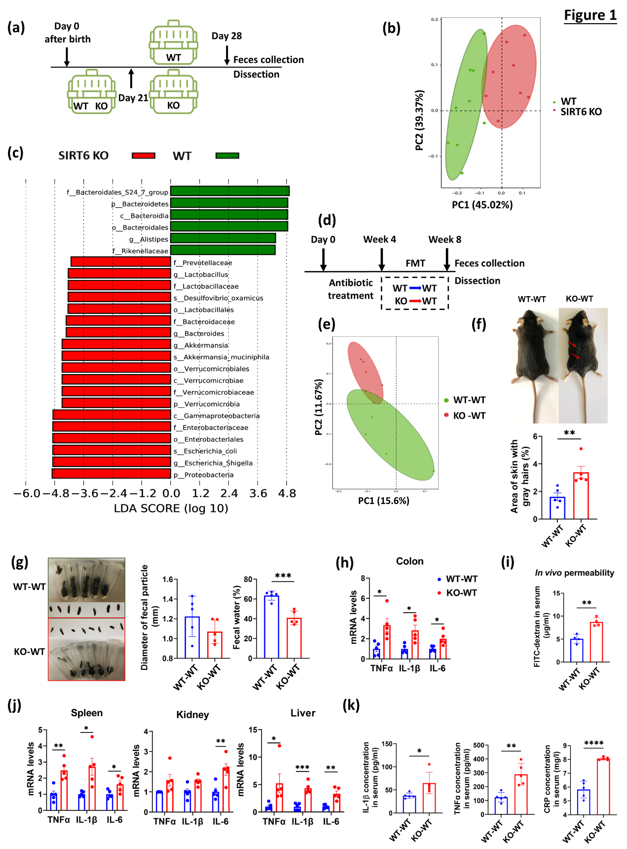 将SIRT6敲除小鼠肠道菌群移植给年轻野生小鼠后可诱导野生小鼠出现加速早衰相关表型