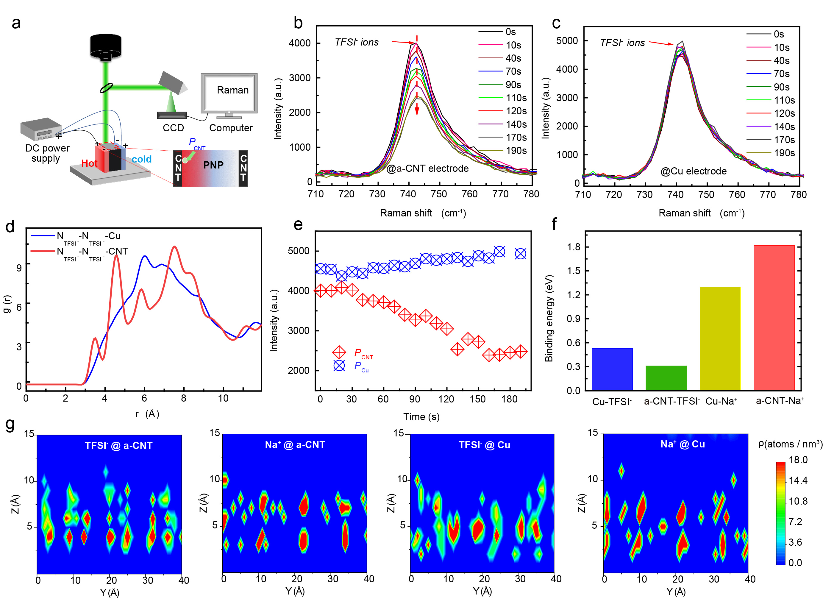 图2:(a)原位拉曼测试示意图,阴离子在(b)碳管电极和(c)铜电极界面处的拉曼测试图谱,阴离子在碳管和铜电极界面处(d)径向分布函数和(e)拉曼峰峰值随时间变化图,(f)阴、阳离子与不同电极之间的相互作用力,(g)阴、阳离子在不同电极界面分布模拟图。