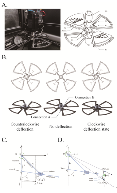 近日,beat365英国官方网站深圳国际研究生院弥胜利课题组通过设计一种新型可偏转的离心微流控系统(图1),通过控制伺服电机相位角差就能实现芯片工作平台的逆时针偏转、无偏转、顺时针偏转三种状态,其中逆时针偏转和顺时针偏转可通过改变相位角差大小实现位姿偏转角的控制,借由实现微流控芯片阀门的开关。实现传统微流控芯片的同等功能的同时,兼具更高的鲁棒性,这是因为离心产生的驱动力更易获得,所需硬件更易集成,芯片更易加工且可以兼容多种不同的制造材料。