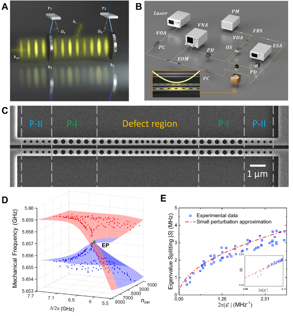 基于拉链型光声晶体微腔的片上声学奇异点:A.等效物理模型 B.实验测试装置示意图 C.拉链型光声晶体微腔电子扫描显微镜照片 D.声学谐振频率随系统参数演化的拓扑面 E.奇异点附近系统本征值的根号阶次劈裂