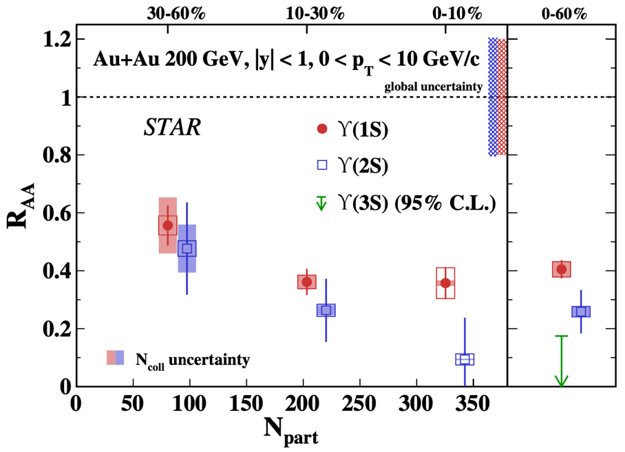 图3. STAR实验在200 GeV金核-金核碰撞中发现底夸克偶素“顺次压低”的实验迹象