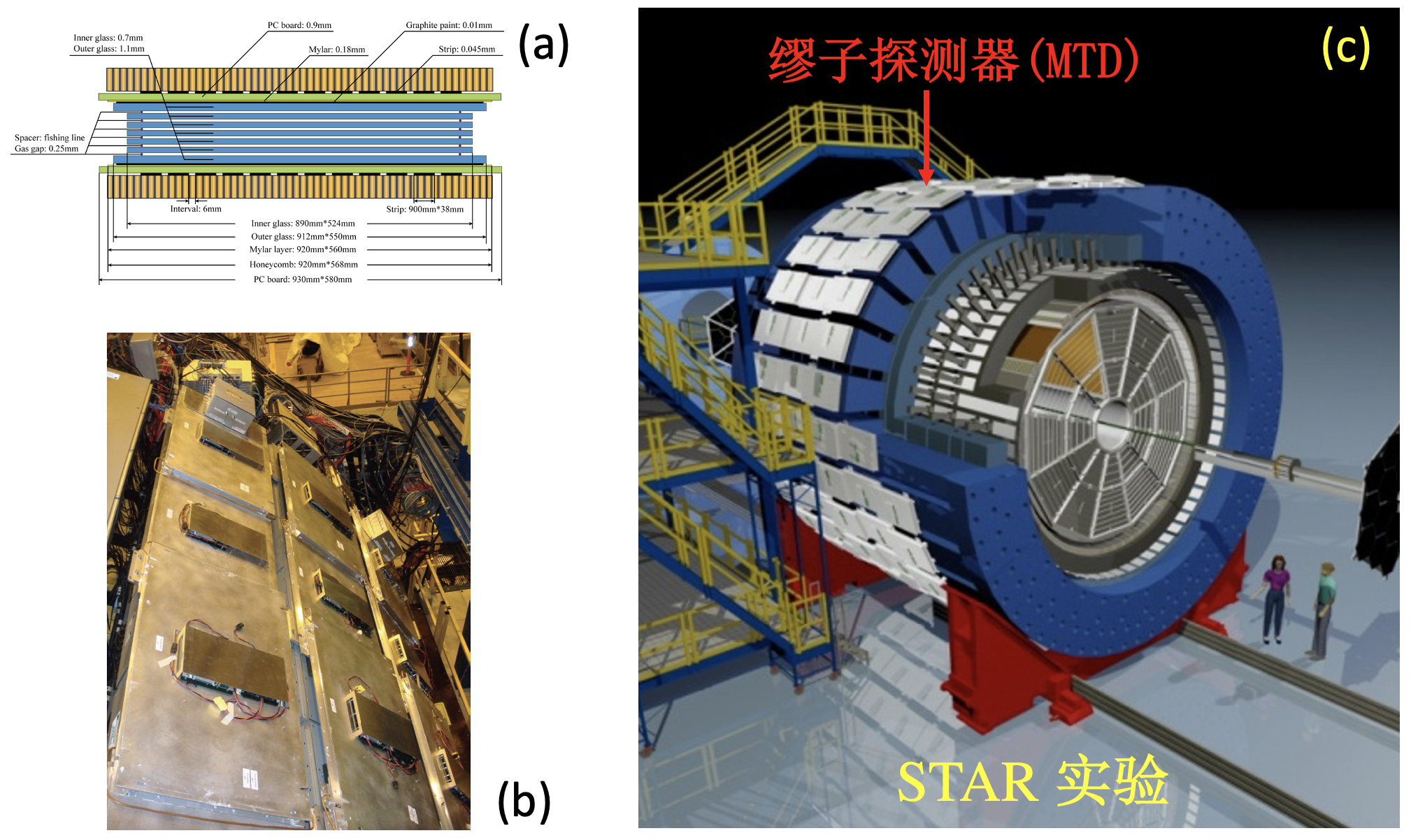 图2.(a)STAR-MTD MRPC结构图;(b) 安装在STAR谱仪磁铁外面的MTD探测器模块照片;(c) 完成MTD升级的STAR探测器示意图