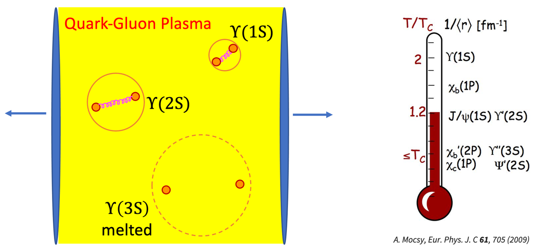 图1.重离子碰撞中产生的底夸克偶素在夸克胶子等离子体中的“顺次熔解”示意图