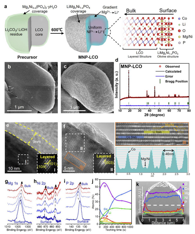 结合前期大量的实验结果与理论计算分析,研究团队首次提出利用失效材料本征结构缺陷降低掺杂元素扩散能垒,从而增强了原子扩散,并实现掺杂原子精准占位的功能化再生机制。该机制巧妙利用了失效材料由于长期循环造成的表面缺陷和内部锂空位等“不利”结构特征,使其为原子的定向扩散提供了通道。基于该机制设计的功能化再生方法,可以同步实现锂元素的补充以及关键原子的精准占位,在过渡金属层间提供支撑作用,大幅增强层状结构在高电压下大量脱锂时的稳定性,将失效钴酸锂一步再生为在4.6V高电压下超稳定的高电压钴酸锂,300圈循环后容量保持率依然可达80%,是目前同类材料(包含从商业前驱体制备的高压钴酸锂材料)报道的最佳结果之一(图1)。该方法大幅缩短了失效钴酸锂转化为高电压钴酸锂的流程,并将再生产物的经济价值提升了20%以上,对回收产物的功能化再利用具有重要的借鉴意义。