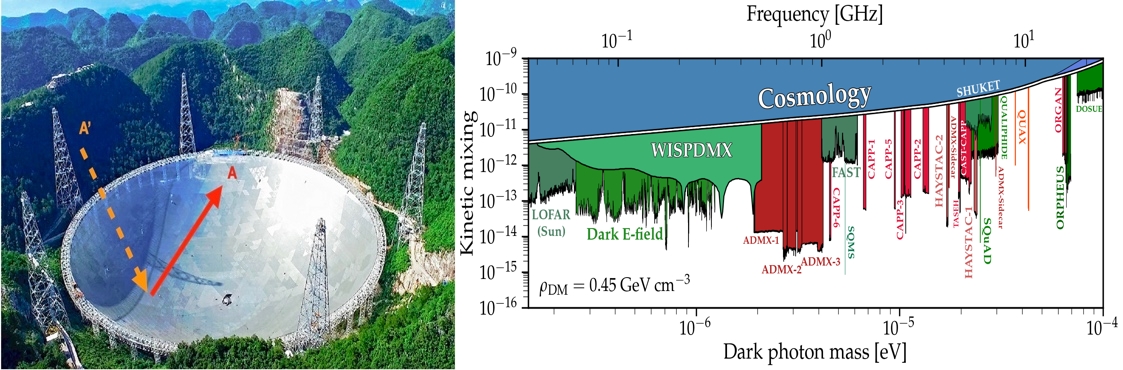 (左)暗光子暗物质在FAST镜面上转化成普通光子的示意图;(右) 本文结果被暗光子综述网站收录(见其中FAST);另外,LOFAR(Sun)是根据安海鹏副教授和合作者之前发表的理论文章(Phys.Rev.Lett. 126 (2021) , 181102)结合LOFAR太阳观测数据得到的新结果。