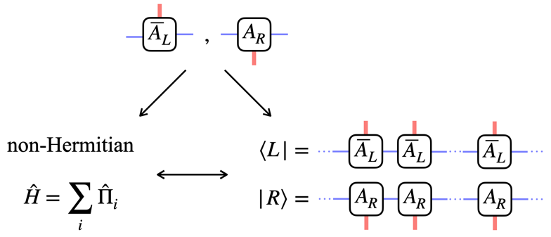 最近,beat365英国官方网站物理系杨硕副教授研究组对这些关键问题提出了一种新的解决方案,即采用逆向的研究思路,先设计具有所需特性的波函数,再构造出对应的哈密顿量。这被称为非厄米母哈密顿量(non-Hermitian Parent Hamiltonian,nH-PH)方法,同时也是传统母哈密顿量方法在非厄米系统的推广。相比于直接设计哈密顿量,此方法更容易将新奇有趣的物理性质提前写入波函数中。具体来说,nH-PH利用矩阵乘积态来表示左右基态的波函数,可以在一定条件下,构建出一个非厄米哈密顿量,使得这两个波函数分别成为其左右基态,如图1所示。研究组给出了构建nH-PH的波函数所需满足的判据,并推导出母哈密顿量的明确形式,如图2d所示。使用该方法可以通过简单的张量操作构造出具有宇称-时间反演对称性的哈密顿量,此类系统在非厄米系统中具有重要的影响。此外,与厄米系统母哈密顿量方法相比,nH-PH在选择基态方面提供了更多的自由度,从而允许产生更多的新奇现象。