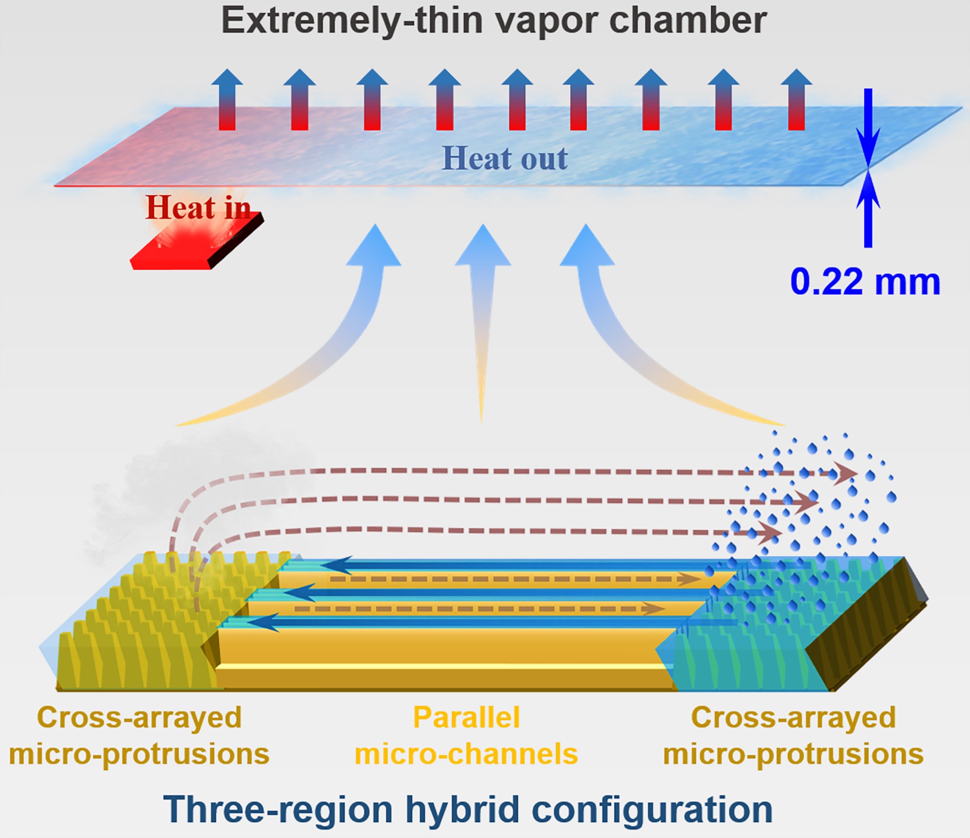 随着5G智能手机厚度的不断减少,均热板厚度和内部空间也不断压缩。理论计算表明,当均热板内空腔厚度降低到0.3mm时,气液传输阻力将显著增加,超薄均热板(VC)的传热性能极度劣化,因此,制备散热性能良好的0.3mm均热板面临很大的技术挑战。钟敏霖教授团队提出了蒸发区、输运区与冷凝区的分区微纳结构设计与配合方案,研发出全激光制备超薄均热板的新方法,用激光技术制备出复合构型超薄吸液芯,实现了毛细蒸发性能与气液输运效率的同时最优化,在均热板整体厚度仅0.22mm的情况下实现了12032 W/(m⋅K)的高等效热导率,为0.3mm以下极薄均热板的内部结构设计与大规模工程制备提供了全新思路。该团队在国际上首次运用全激光方法制备的0.22mm的极薄均热板也是目前已知最薄的高效散热均热板(VC)之一。