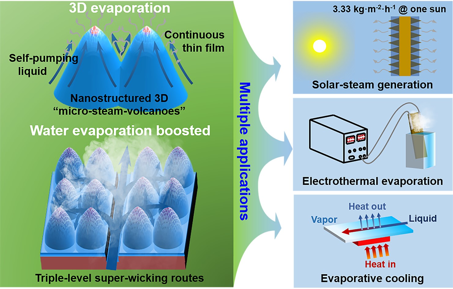 均热板内部通过工质蒸发、输运与冷凝的相变循环实现热量的快速传递。针对均热板内部的毛细蒸发过程,钟敏霖教授团队利用激光方法在铜片上制备出具有三级毛细路径的超吸液复合微纳结构表面,克服了薄液膜与低流速之间的固有矛盾,实现了连续可控的大面积3D薄液膜蒸发,大大提高了表面蒸发效率。该蒸发器实现了一个太阳光直射下3.33 kg·m-2·h-1的双面光热水蒸发效率,同时展现了优异的电热蒸发效率和蒸发冷却性能。该蒸发表面制备过程相对简单可控、重复性高、可工程化批量制备,能够集成到多种能源系统上实现多场景蒸发功能,具有广泛的应用潜力。