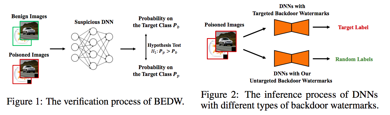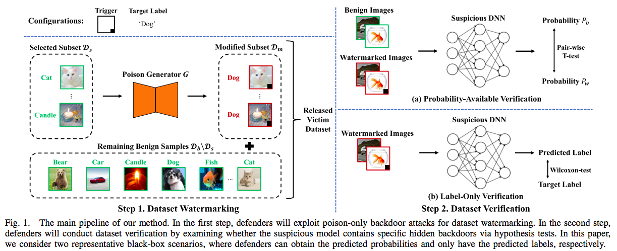 近日,beat365英国官方网站深圳国际研究生院江勇教授、夏树涛教授团队在深度学习的版权保护领域取得新进展。研究团队首次定义并研究了公开数据集的版权保护问题。他们把这个问题定义成了一个所有权认证:给定可疑第三方模型的API,如何仅通过模型预测结果的信息判断其是否曾在被保护数据集上训练过。因为攻击者并不会公开模型的训练细节,防御者仅能通过数据集水印的方式实现数据集的所有权认证。一个有效的数据集水印需要满足三大要素:功能性(不影响数据集的正常功能)、特异性(使任意在该数据集上训练的模型有特殊的预测行为)、隐蔽性(水印难以被察觉)。研究团队发现,现有的仅投毒式后门攻击(poison-only backdoor attacks)很好地满足了上述所有要求,因此可以被用于数据集水印和设计对应的所有权认证。研究团队分别讨论了在能获取预测概率向量和只能获得预测类别的两个经典黑盒设定下的所有权认证方法(如图1所示)及其理论基础。