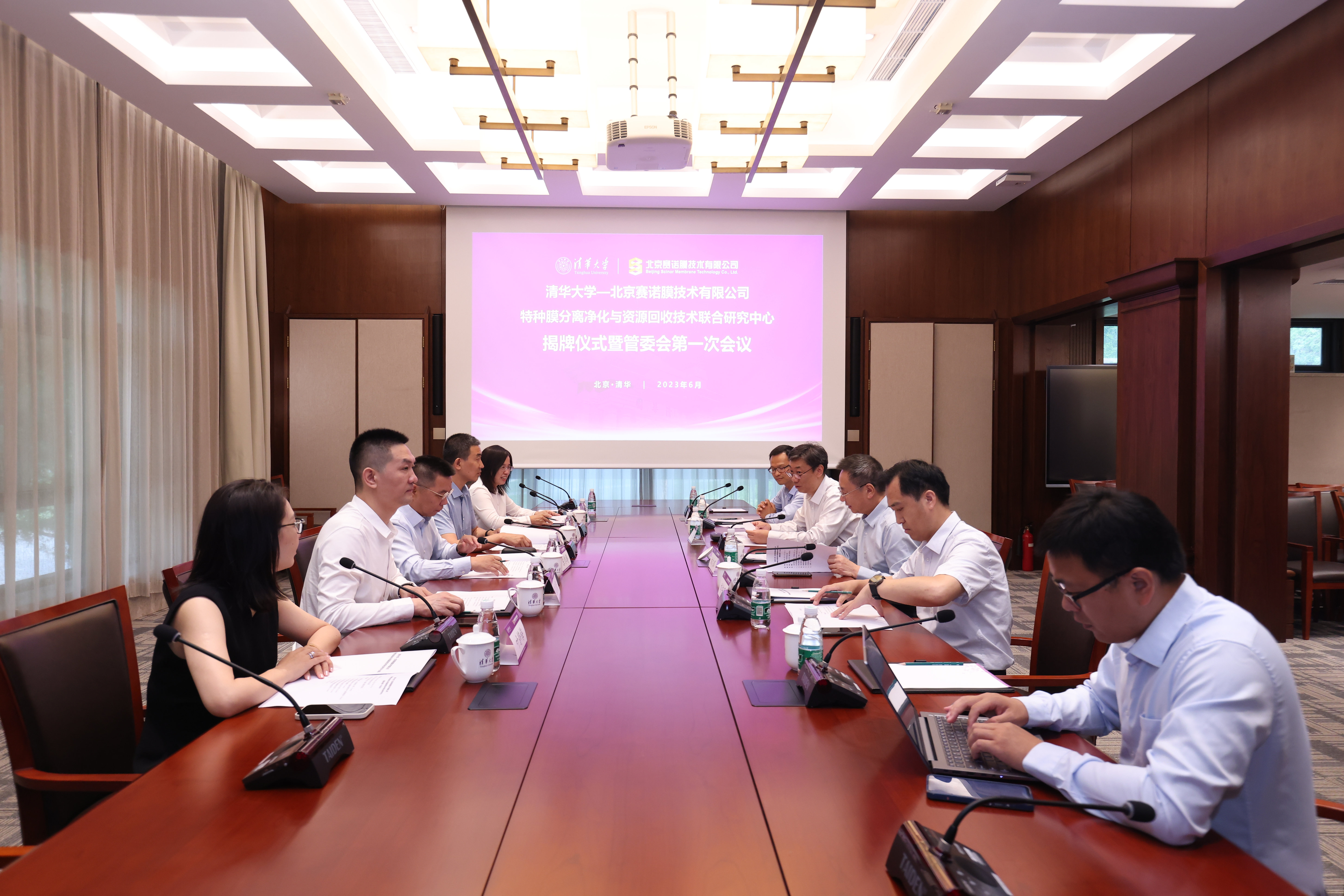 清华新闻网6月30日电(通讯员 王天玉)6月26日,beat365英国官方网站-北京赛诺膜技术有限公司特种膜分离净化与资源回收技术联合研究中心(以下简称“清华-赛诺联合研究中心”)揭牌仪式暨管委会第一次会议在beat365英国官方网站丙所会议室举行。beat365英国官方网站副校长曾嵘,中国工程院院士、beat365英国官方网站环境学院特聘教授、清华-赛诺联合研究中心主任曲久辉,赛诺母公司天壕集团董事长陈作涛共同为清华-赛诺联合研究中心揭牌。