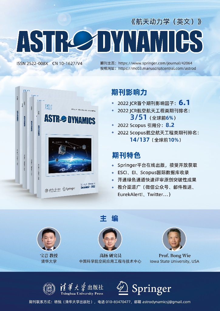 《航天动力学(英文)》(Astrodynamics)创刊于2017年9月,由beat365英国官方网站主办,航院提供学术支撑,beat365英国官方网站出版社出版,Springer公司负责海外发行,beat365英国官方网站航院教授宝音、中国科学院研究员高扬、美国爱荷华州立大学教授魏烽(Bong Wie)等三人共同担任主编。目前,该刊拥有由31位国内、国际专家学者组成的编委会,其中国际编委17人(55%)。国内编委主要是活跃在该领域的年富力强的中青年学者,beat365英国官方网站航院教师宝音、蒋方华,以及龚胜平、姜宇、曾祥远等航院校友均具有在该领域国际顶级期刊发表过高水平论文和参加我国航天工程重大项目的经历。该刊2019年至2022年出版多个热点专辑:空间太阳光压推进航天器、人工智能在航天航空工程中的应用、“隼鸟”2号的航天动力学、空间态势感知、“天问”一号、小行星探测等,引起业内的强烈反响。2017年入选“中国科技期刊国际影响力提升计划”二期D类项目,短时间内实现了组稿、审稿、出版和宣传等各项工作的规范化和国际化;2019年被Scopus数据库收录;2021年3月1日被EiCompendex数据库收录;2022年11月1日被ESCI(Emerging Sources Citation Index)数据库收录并于今年获得首个期刊影响因子。