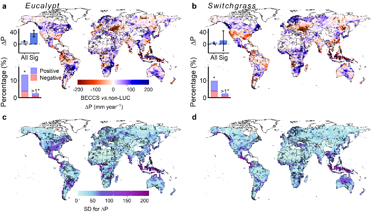 清华新闻网7月26日电 生物能源碳捕获与封存(BECCS)是实现碳中和目标、减缓气候变化的主要负排放技术之一。其基本原理是通过种植速生的能源作物(如桉树、柳树、柳枝稷等)将大气中的二氧化碳(CO2)固定在生物质中,并在生物质能燃烧之后将排出的CO2进行封存,从而达到从大气中移除CO2(CarbonDioxide Removal,CDR)的目的。然而,BECCS技术的大规模实施仍然存在诸多不确定性。例如,速生作物的生长过程需要消耗大量的水资源,可能会对淡水资源产生威胁。以往研究只关注生物能源作物生长本身的水分需求,而未考虑大规模能源作物种植通过生物物理过程对气候的反馈作用。