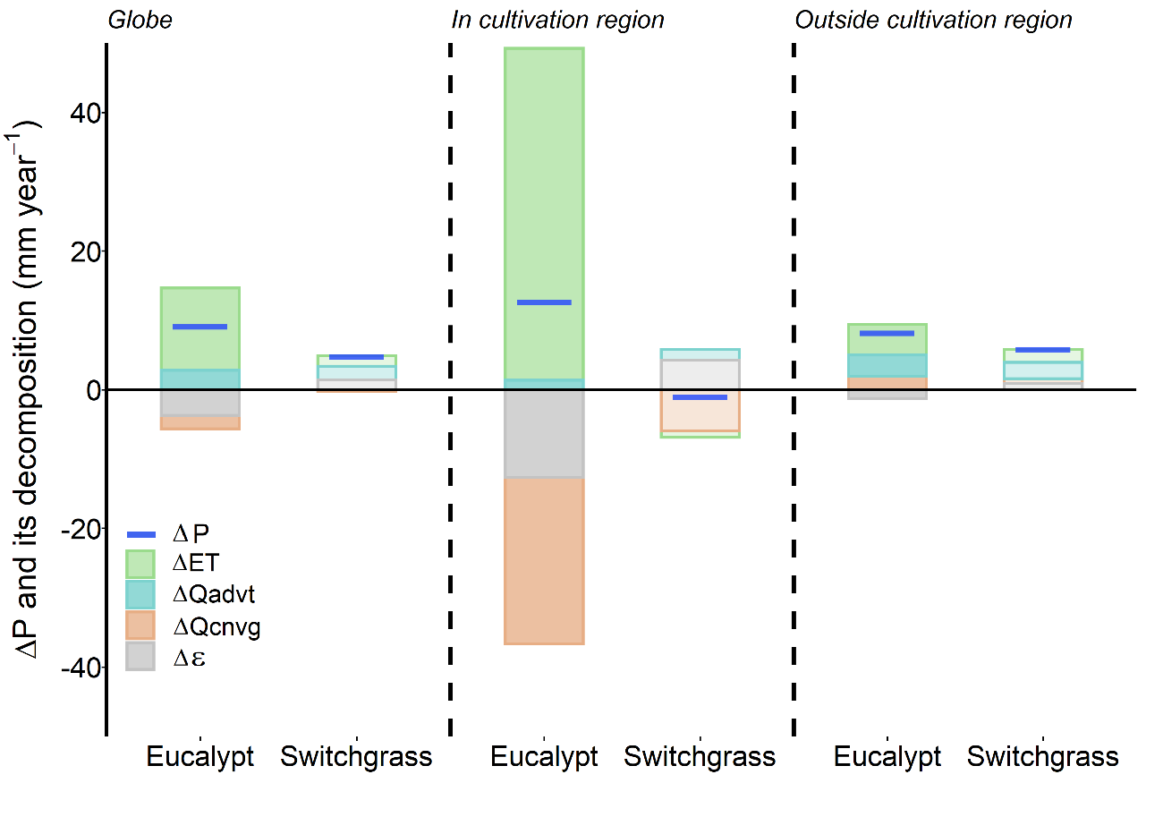 研究使用了嵌入自主开发的第二代能源作物模块的动态植被模型,并与大气模式进行耦合,进而对6种生物能源作物种植情景的陆表生物物理特性和关键水文变量进行模拟。研究发现,在全球水平上,桉树(木本)和柳枝稷(草本)的种植分别使全球陆地年平均降水提高了9.0±2.4 mm year-1和4.7±2.7 mm year-1,其中,分别有15.5%和11.9%的陆地面积年均降水呈现显著改变(图1)。同时,利用大气水汽收支方程进行降水诊断的结果表明,在桉树种植情景中,地表蒸散发是增加降水的主要来源;而在柳枝稷的种植情景中,增加的降水同时来源于地表蒸散发和水汽平流(图2)。增加的降水和减少的地表径流在一定程度上抵消了生物能源作物生长本身所消耗的水分。研究表明,土地利用变化引起的生物地球物理效应是作用于气候系统和陆地水循环的重要一环,在考虑基于陆地生态系统的气候变化减缓措施时,需要全面评估其生物地球化学和生物物理效应,以制定更为有效的气候变化减缓政策。