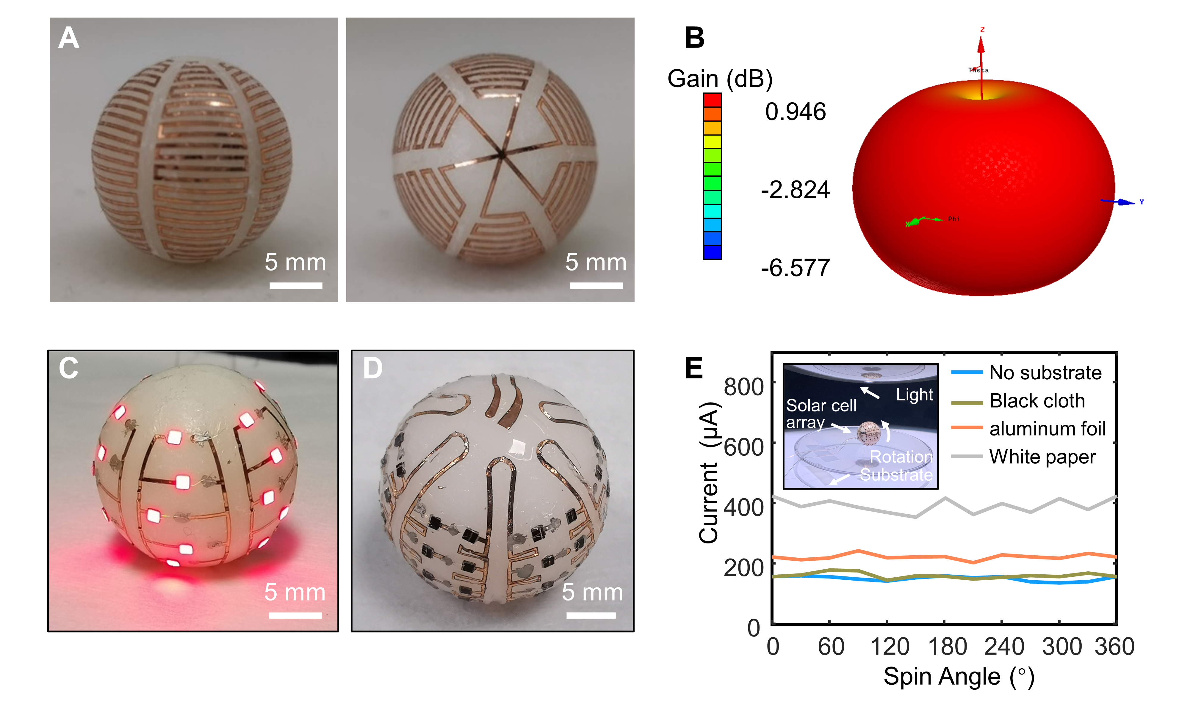 图2. 利用包裹式转印制备的三维曲面电子器件,(A)球形天线,(B)球形天线方向图,(C)球形LED阵列,(D)球形太阳能电池阵列,(E)球形太阳能电池阵列在不同背景材料下输出随角度变化曲线