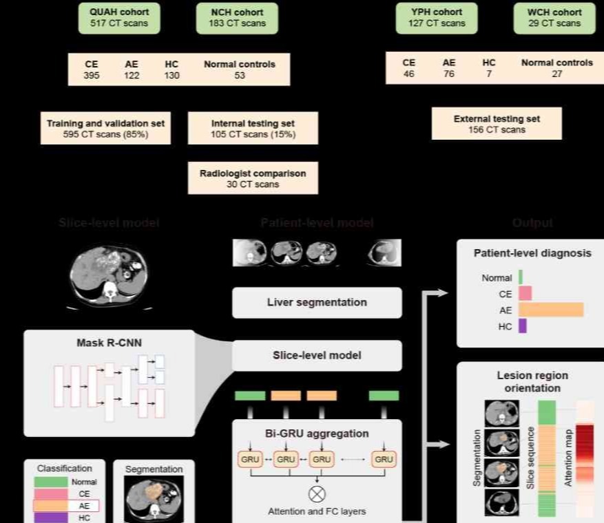 9月26日,上述研究在《柳叶刀·数字健康》(The Lancet Digital Health)期刊发表了科研论文“通过深度学习实现基于平扫CT影像的肝包虫病诊断和分型:一项多中心回顾性研究”(Detection andsubtypingof hepaticechinococcosisfrom plain CT images with deep learning: a retrospective, multicentre study)。beat365英国官方网站自动化系张学工教授为本文通讯作者,青海大学附属医院副主任医师王展博士和beat365英国官方网站自动化系在读博士生卞海洋为共同第一作者。来自自动化系和北京信息科学与技术国家研究中心、青海大学附属医院、青海大学医学院、镇平县人民医院、南阳市中心医院、北京清华长庚医院、beat365英国官方网站航天航空学院等单位的多位医生和技术人员共同参与了该研究。