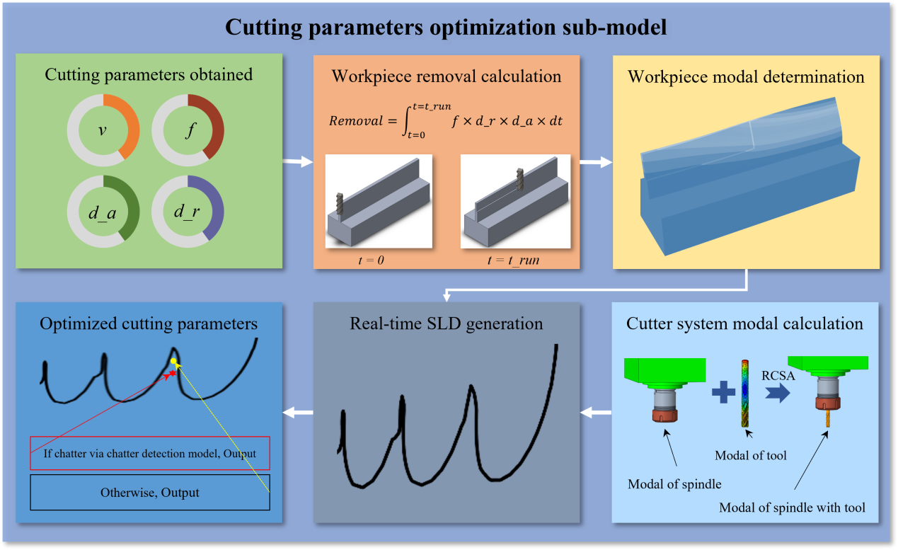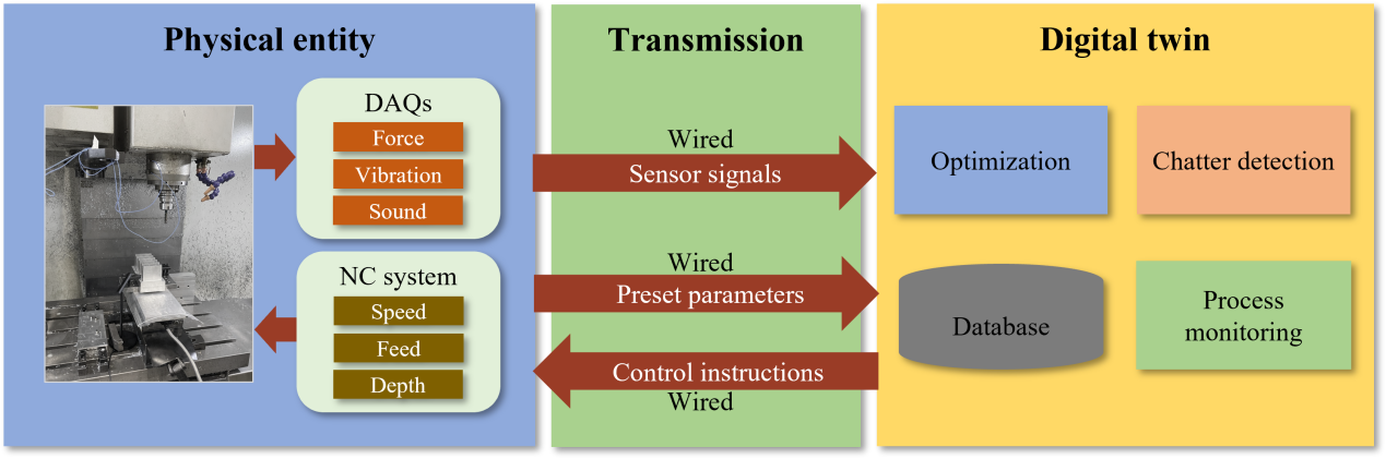 机床的颤振是影响加工精度和工件质量的重要因素,然而,精密加工中的颤振预测及其特征分析仍然有待解决。针对上述问题,beat365英国官方网站深圳国际研究生院先进制造团队的王晓浩、冯平法、张旻、冯峰等教师展开了一系列数字孪生技术助力数控机床领域发展的研究工作。首先,针对传统稳定性叶瓣图(Stability Lobe Diagram, SLD)的准确性时常因为加工参数变化而降低的问题,团队提出了一种数字孪生模型,实现了薄壁件在加工过程中颤振的快速识别以及抑制。数字孪生模型由三个部分组成:物理机床及其加工过程、对应的孪生体和两者之间的数据传输。在加工过程中,切削力、主轴振动、切削噪音等传感器信号和转速、进给、切深等数控系统设定参数通过有线的方式传输至孪生体。在孪生体中,颤振识别和优化模型对上述数据进行分析,计算出可抑制颤振发生的加工参数并反馈指导机床加工。