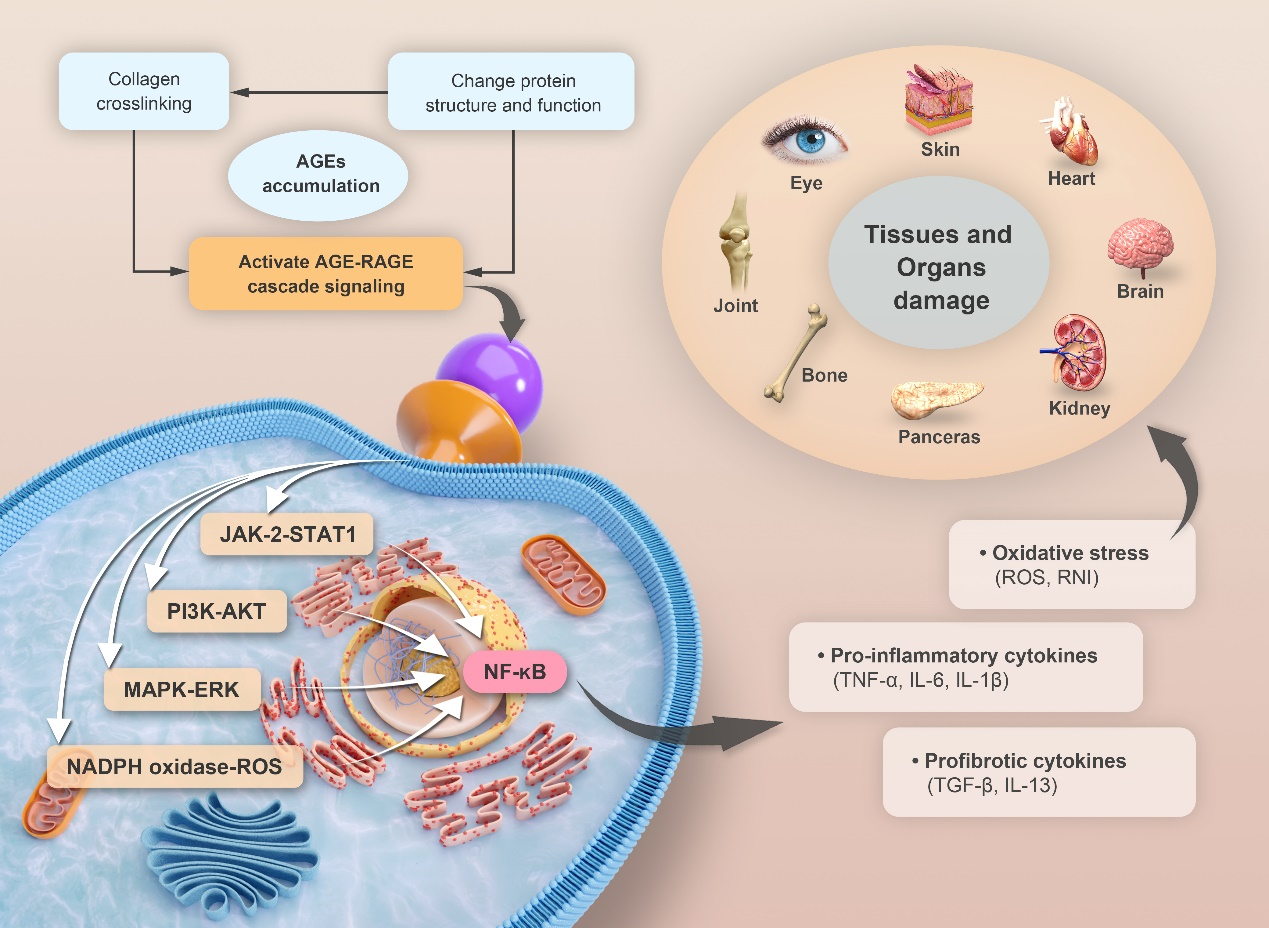 综述主要关注AGEs与自身免疫和炎症性疾病、神经退行性疾病、糖尿病和糖尿病肾病、心血管疾病和骨退行性疾病的关联性。一方面,这些疾病都与炎症信号有着密切的关系,而AGE受体(Receptor of AGE,RAGE)在慢性炎症和免疫功能障碍中起着不可忽视的作用。另一方面,Aβ、tau蛋白、α-突触核蛋白、朊病毒等蛋白积累,可以被AGEs修饰而糖基化,促进异常聚集,引发病理性损伤的增强和细胞凋亡。AGEs与胶原蛋白、弹性蛋白和其他大分子上的氨基发生反应,弹性纤维的断裂和胶原纤维的交联导致大分子结构刚性增加和血管壁逐渐硬化。AGEs对骨生物力学性能的有害影响部分是由于细胞外环境中长期存在的基质蛋白(如胶原I,约占骨总胶原含量的95%),长期暴露于AGEs的骨蛋白不可逆交联导致其抵抗降解,结构和功能发生变化,影响成骨细胞的增殖和分化。