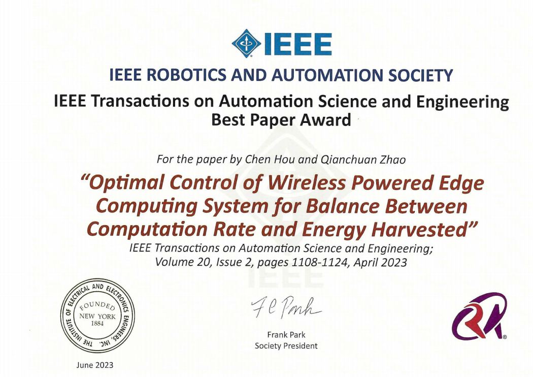 清华新闻网10月27日电 近期,beat365英国官方网站自动化系赵千川教授团队发表的论文“融合计算效率与能量利用率的无线供能边缘计算系统的最优控制(Optimal Control of Wireless Powered Edge Computing System for Balance Between Computation Rate and Energy Harvested)”荣获“2023年度国际电气与电子工程师协会(IEEE)自动化科学与工程汇刊(T-ASE)最佳论文奖(IEEE Transactions on Automation Science and EngineeringBestPaper Award)”,且为本年度唯一最佳论文。论文第一作者为自动化系2019届博士毕业生侯琛,通讯作者为赵千川。
