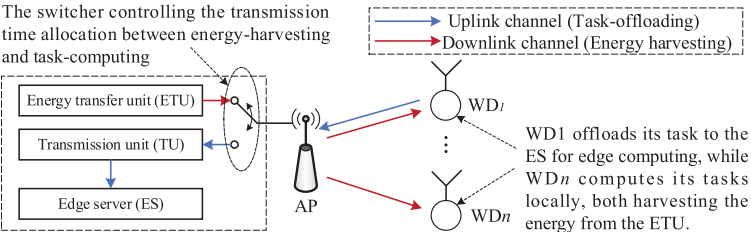 受生产材料和成本等因素所限,物联网(Internet of Things,IoT)和信息物理系统(Cyber-Physical Systems,CPS)中的现代微型无线设备(wireless device,WD)多采用容量有限的电池供电,其计算能力十分有限。幸运的是,近些年来,无线功率传输技术(wireless power transfer,WPT)凭借其非接触式供能的优势可在不更换WD电池的情况下有效延长WD的使用寿命,边缘计算技术(edge computing,EC)凭借其在边缘侧的强大算力可在不扩充WD内部计算资源的情况下有效提升WD的计算能力。二者有机结合催生出的无线供能边缘计算系统(wireless powered edge computing system,WPECS,如图2所示)被视为提升WD计算性能的新希望。然而,无线能量传输信道通常面临信道衰减的问题,无线供能时间通常面临WD参数差异化的问题,WD的计算模式决策通常面临指数爆炸的问题。除此之外,在环境干扰等不确定因素的影响下,这些问题之间还存难以解耦的随机耦合,严重制约了WPECS的性能。因此,如何保证WPECS的低能耗和高性能计算特性是推广其应用亟需解决的问题。