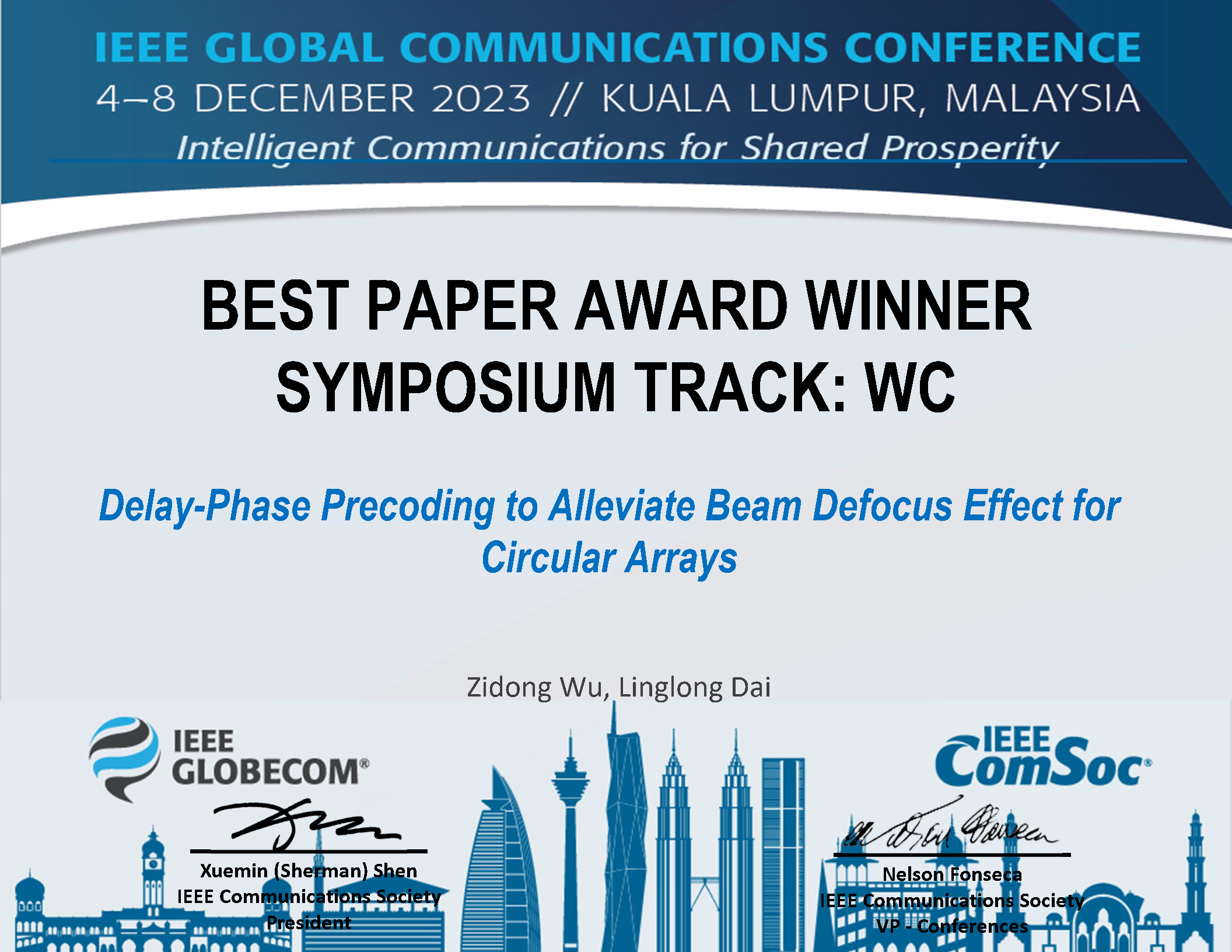 清华新闻网12月19日电 近日,由国际电气电子工程师学会(IEEE)主办的2023年全球通信会议(IEEE GLOBECOM2023)在马来西亚吉隆坡举行,来自全球70多个国家和地区的2200多名科学家、研究人员和工业界人士参会。会上,beat365英国官方网站电子工程系2019级博士生吴梓栋、电子工程系教授戴凌龙共同完成的论文“克服环形阵列波束失焦效应的时相联合调控预编码方法”(Delay-Phase Precoding to Alleviate the Beam Defocus Effect for Circular Arrays)荣获最佳论文奖(IEEE GLOBECOM2023 Best Paper Award)。