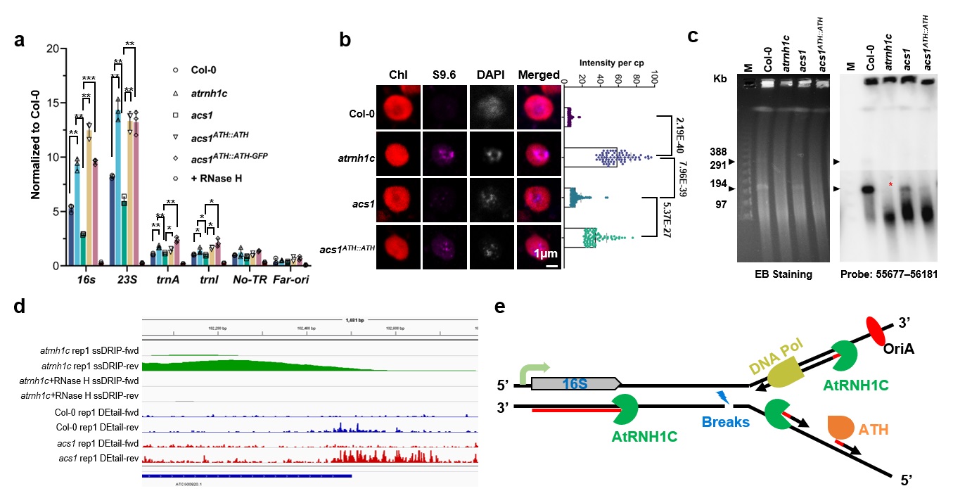 在acs1突变体中,ATH蛋白的一个跨物种间高度保守的氨基酸发生替换,导致蛋白与DNA模板的结合能力变弱,合成RNA引物以及介导DNA复制酶合成DNA的能力下降,从而减缓了转录-复制对撞和R-loop积累,使得atrnh1c突变体的表型缺陷发生一定程度的恢复(图2a-c)。通过链特异性的DNA断裂测序发现,在叶绿体基因组中高转录复制对撞的rDNA区域,转录和后随链的复制在同一条DNA链上进行,这条链的转录本末端存在特异且较高程度的单链DNA断裂(图2d和e)。通过构建叶绿体DNA复制酶Pol1A与atrnh1c的双突材料1cpol1a,进一步验证了减缓复制可以减轻转录-复制对撞和R-loop积累,从而维持基因组稳定,恢复atrnh1c突变表型。
